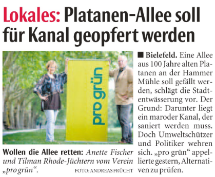 Ergebnis der pro-grün-Initiative Platanenallee: pro grün hat sich erstmals im Sommer 2011 zum Erhalt der Platanenallee zwischen Teutoburger Straße und Stauteich I positioniert.
